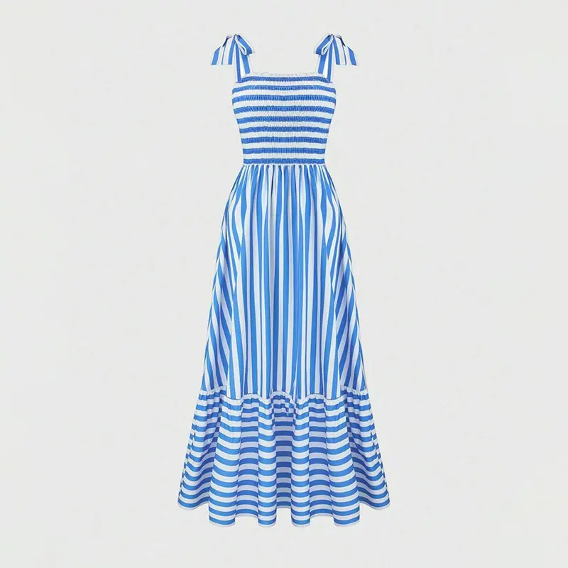 Huili Manufacturer Custom Print Summer Strappy Backless 100% Cotton Boho Polynesian Striped Maxi Dress with Flare Hem Full Skirt